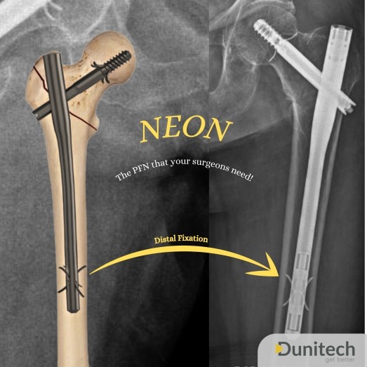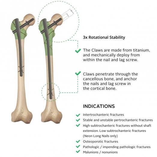 Neon PFN, proksimal femur kırıklarının tedavisi için tasarlanmış bir titanyum çividir. Distal uçta ve lag vidasında Claw teknolojisinin kullanıldığı bu çivi, cerrahların ameliyathanede en iyi performanslarını göstermelerini sağlar. Neon\’un, kılavuz tel uygulamalarına uygun tam kanüllü gövdelere sahip Kısa ve Uzun versiyonları bulunmaktadır.